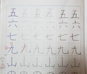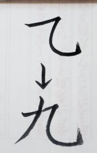 書き直した後ですが、ノート開いてすぐ【九】に目が行きました。念のため書き順を聞くと…