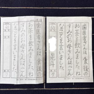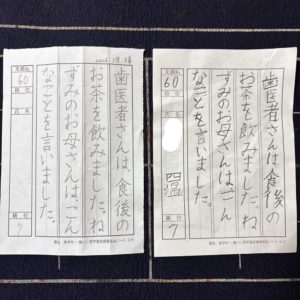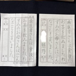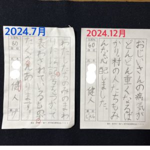向かって左の作品は、行からはみ出た文字がありました。書き直しの為、紙面も汚しています。右の作品は、5ヵ月の練習の成果が出ている作品。どちらも右手で書いています☆