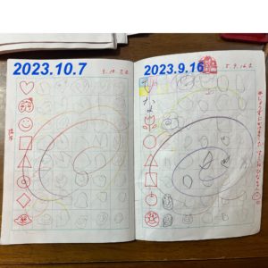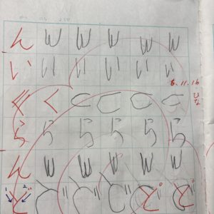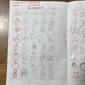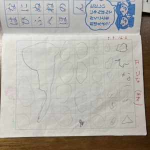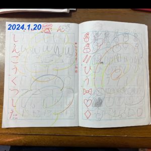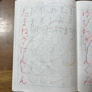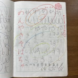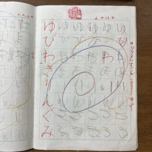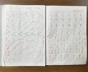 写真は切れていますが、向かって右側のページはひらがなを練習しています。