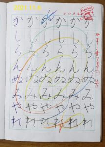 こちらの生徒さまは、私の書き直し指示や「こうしてね!」の指示も一切嫌な顔ひとつせず、「はーい!」と毎度返事をして取り組んでくれました。ひらがなが整うまで時間が掛かりましたが、書き込んだ分しっかり結果を受け取っています。必ず今後の美文字習得に活きます。習得までの時間は鉛筆の持ち方・書く姿勢・心理的な要素が絡み合い個人差がありますので、どうぞ気にされませんように。良いも悪いもありませんので(^_-)-☆みんなちがってみんないいのですよ~☆