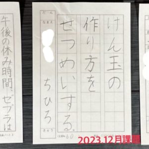 無料体験では、鉛筆の持ち方・書く姿勢、ひらがなを書いてもらうので、その書き順をチェックします。大抵、字形が崩れている文字は、書き順間違えが多いです。