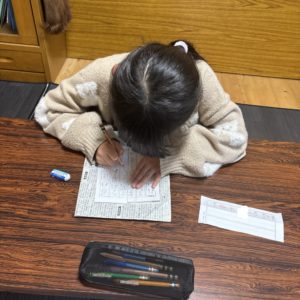 入会当初は、ちょっとおしゃべりが多いかな?の印象でしたが、現在のレッスンでは全く。「あれ?ちーちゃん、どこ行ったかな?」くらい集中力を発揮し書き込んでいます。もちろん、必要な気分転換になる会話はあります(o^―^o)