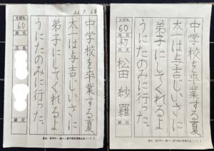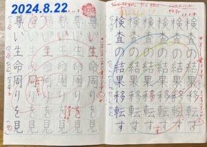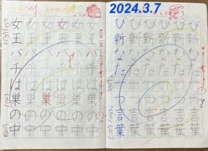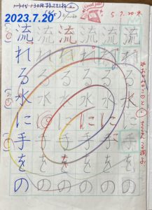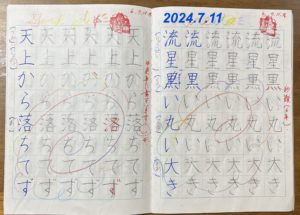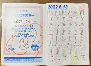 現在、当時のさらちゃんと同じ低学年で入会し、左利きですが右手で挑戦中の生徒がいます。今回のさらちゃんの字の変化が本人もさることながら、それを支える親御さまの参考・励みになって頂けると幸いです(o^―^o)