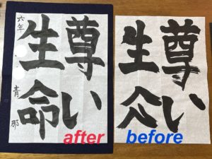 予想通り【命】の右払いが上手くいかず。ただ、指導後は見違えるように文字が整いました!