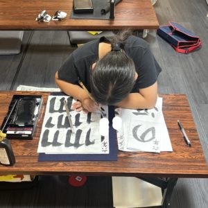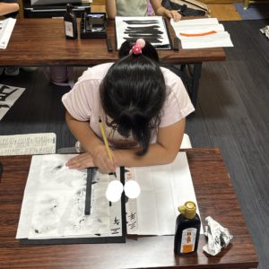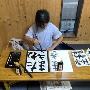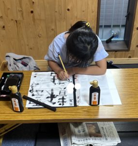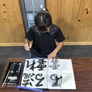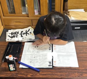 こちらの生徒は、使用が難しい羊毛筆で書いています。