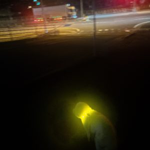 ネオンカラーのレオン君。毛が白いので、発光体そのものwww光るトラックと共に☆
